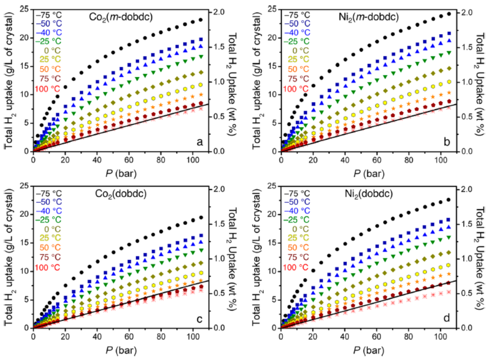 The authors from UC Berkeley, LBNL, NREL, NIST and partners developed Ni₂(m-dobdc) MOF with record open-metal-site density, achieving 23 g L⁻¹ usable H₂ capacity (−75 → 25 °C, 100 → 5 bar) for near-ambient automotive storage.